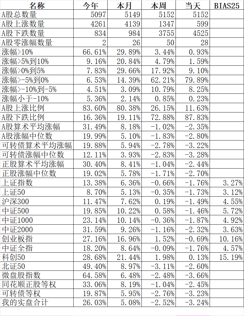 599只个股上涨、4525只个股下跌,涨幅中位数-2.80%。