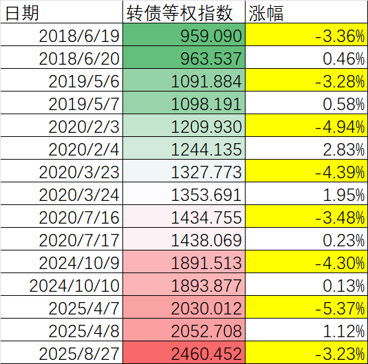 今天可转债遭到正股下跌和转股溢价率下跌的双重因素。其实也算是很正常的。按照集思录的可转债等权指数的统计,从2018年起的8年里面,日跌幅超过今天3.23%的,一共有7次,平均差不多每年要发生一次: