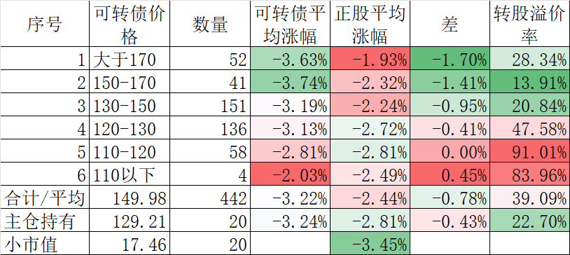 442只可转债大跌3.22%,对应正股大跌2.44%。我的主仓20只可转债平均下跌3.24%,对应正股平均下跌2.81%。